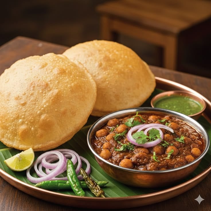 Chole Bhature là sự kết hợp giữa cà ri đậu gà cay nồng (Chole) và bánh mì chiên khổng lồ (Bhature). Khác với Chana Masala, Chole thường được nấu đậm màu và cay hơn nhờ sử dụng trà đen hoặc các loại gia vị sẫm màu. Bánh Bhature được làm từ bột mì lên men với sữa chua, khi chiên sẽ phồng to như một quả bóng.